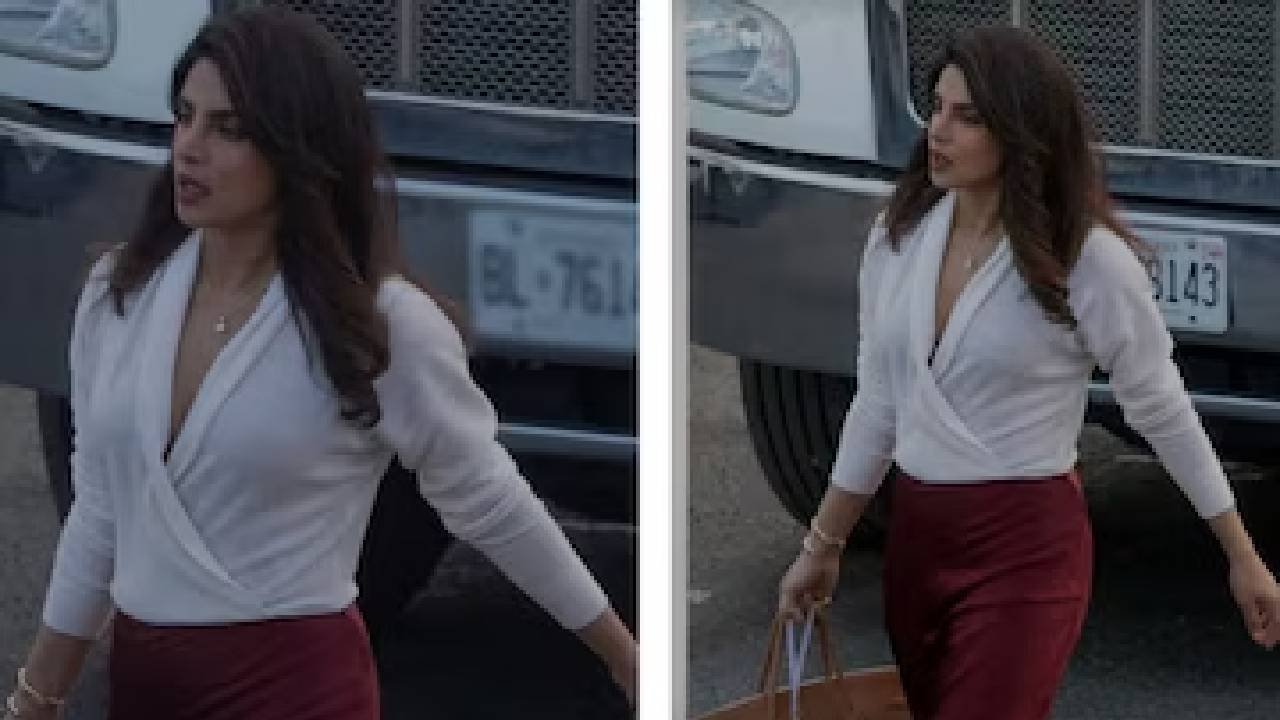 फिल्म के सेट पर प्रियंका ने सफ़ेद रंग का बुना हुआ ब्लाउज पहना था जिसमें गहरी वी-नेकलाइन, रिब्ड कफ के साथ लंबी आस्तीन और रैप डिज़ाइन था जो उनके सिल्हूट को उभार रहा था। उन्होंने ब्लाउज को एक आकर्षक चेरी-लाल साटन मिडी स्कर्ट के साथ पहना था, जिसे हाई-राइज़ कमर और फिगर-हगिंग कट के साथ डिज़ाइन किया गया था, जो इस मौसम के ट्रेंडिंग रंगों में से एक था।