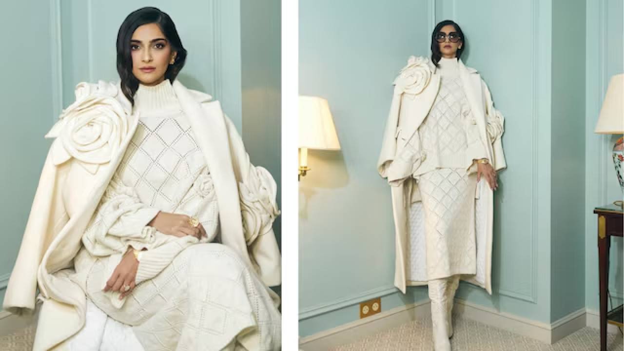 सोनम के कॉउचर आउटफिट में खूबसूरती से तैयार किया गया बुना हुआ स्वेटर था, जिस पर जटिल क्रॉस-स्टिच डिटेलिंग और नाज़ुक आईलेट्स थे, जो इसमें एक शानदार तत्व जोड़ते हैं। हाई टर्टलनेक, रिब्ड कफ और हेम ने एक संरचित लेकिन आरामदायक सिल्हूट दिया, जबकि पूरी लंबाई वाली फ्लेयर्ड स्लीव्स और बाजुओं पर कढ़ाई वाले गुलाब के आकार के फ्लोरेट्स ने डिज़ाइन को और भी बेहतर बना दिया। मैचिंग फिगर-स्किमिंग स्कर्ट के साथ जो स्वेटर की नाज़ुक शिल्प कौशल को दर्शाता है, लुक में परिष्कार झलकता है।