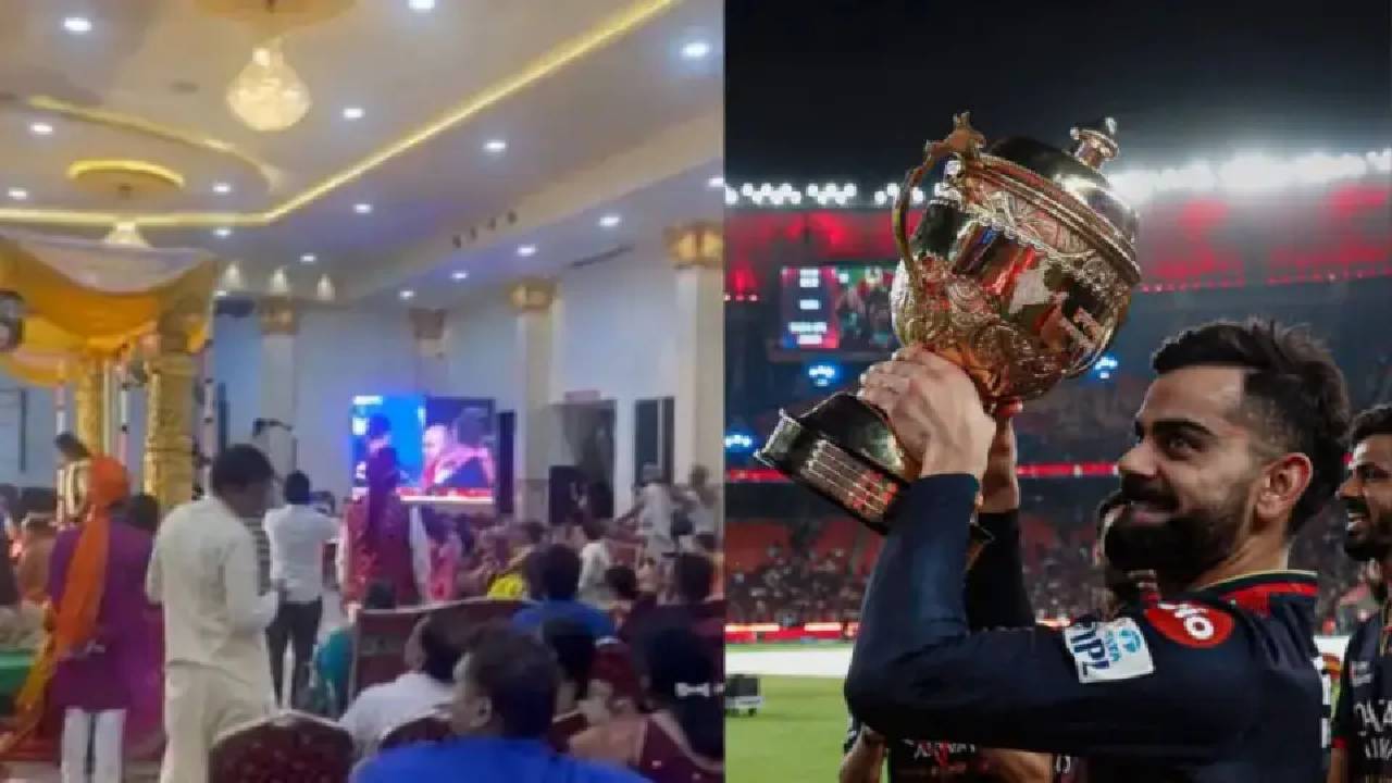 वायरल हो रहे वीडियो में आप देख सकते हैं कि शादी के मंडप के पास एक बड़ी एलईडी स्क्रीन लगाई गई है, जिस पर फाइनल मैच का लाइव प्रसारण हो रहा था। जैसे ही आरसीबी ने 18 साल बाद अपनी पहली ट्रॉफी जीती, वहां मौजूद हर कोई खुशी से झूम उठा। दूल्हा-दुल्हन खुद को रोक नहीं पाए और जश्न में शामिल हो गए और लोगों ने न सिर्फ उन्हें बल्कि विराट कोहली और टीम के बाकी खिलाड़ियों को भी चीयर करना शुरू कर दिया। शादी का माहौल मिनी क्रिकेट स्टेडियम में तब्दील हो गया था।